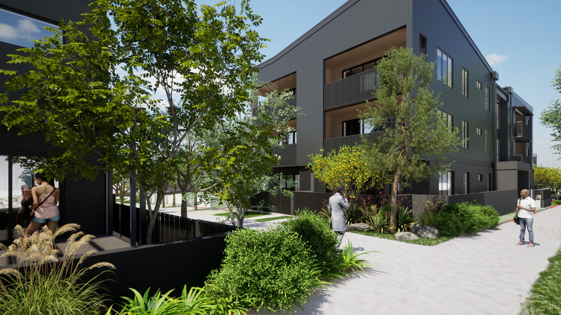 Along Tripoli Road, the buildings take on a more defined, urban character, creating a buffer from traffic and giving the street a clear edge. Further in, the development opens up with lighter, quieter homes, shared outdoor spaces, and walking links to local parks, schools and shops.