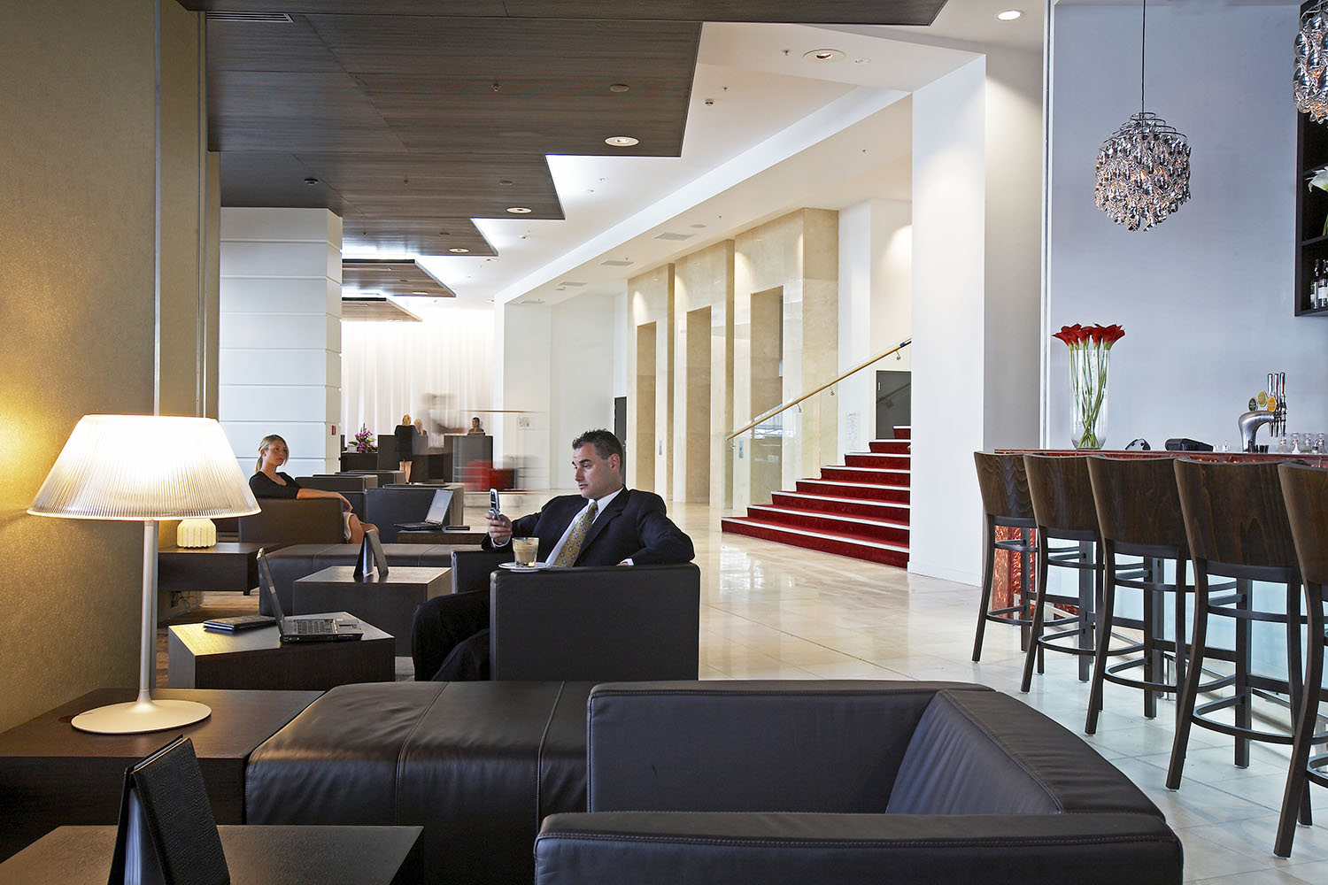 Completed in association with Peddle Thorp Architects, the seventeen storey building takes the form of a large podium covering the entire site up to four levels high, with a slender accommodation tower rising from the centre. Angled setbacks are utilised to offer stunning sea or Parliament views in all of the hotel’s 280 rooms, visually extending the apparent size of the rooms, while full height precast concrete ribbed fins provide valuable privacy and sunshading. The interior design of the rooms employs rich autumnal colours and natural textures to imbue them with a sense of warmth, luxury and quality.