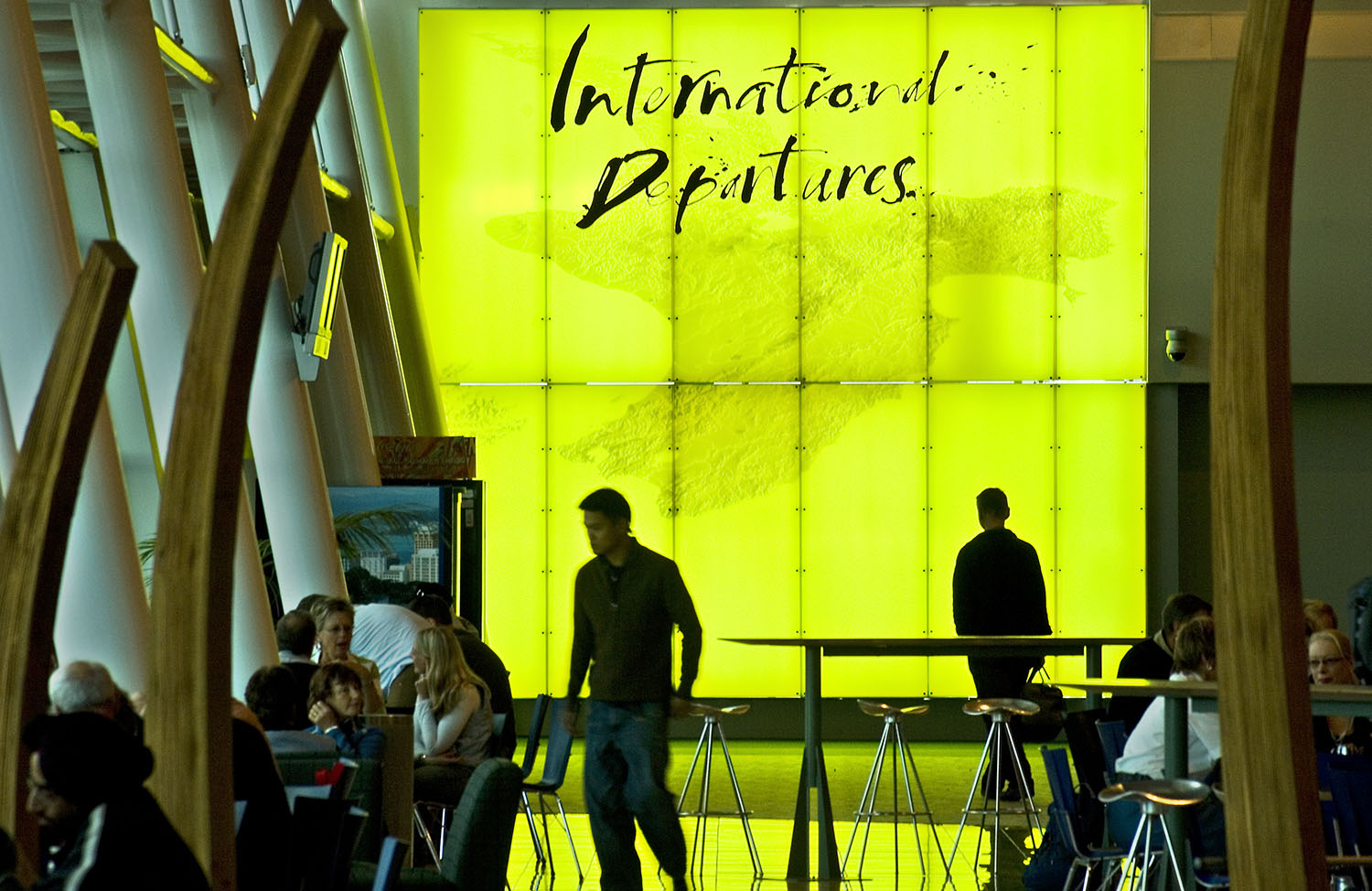 The layout of the terminal was rationalised to create clear navigation pathways. A new entry point into the expanding queue area was created, with a double-height illuminated wall in brilliant yellow-green used to aid intuitive way finding. Functioning as a linking device throughout the refurbished area, the new carpet, with a pattern of pebbles inspired by the nearby rocky Wellington south coast foreshore, ties in with the aquarium and the graphic theming of the illuminated wall.